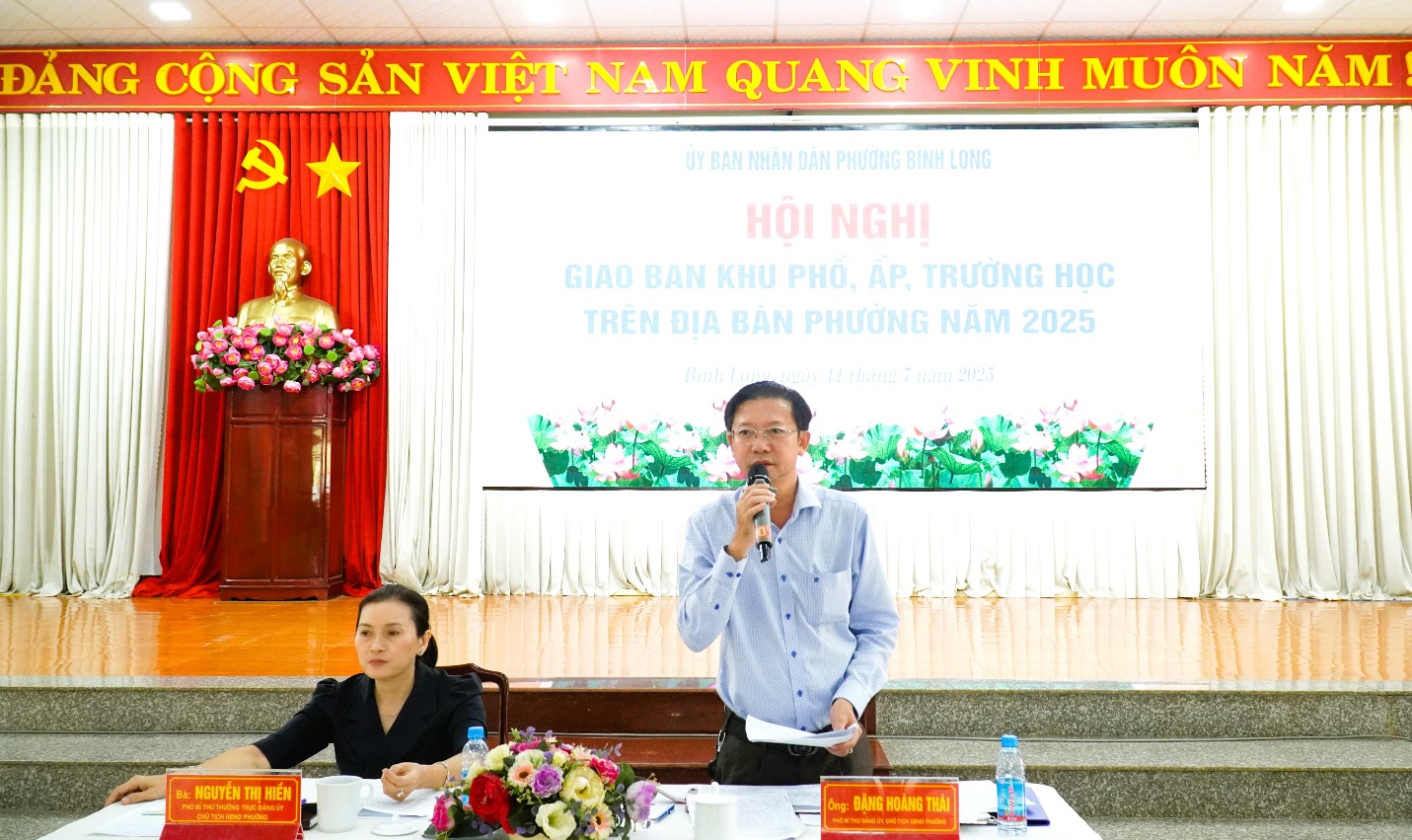 Sáng ngày 11-7, UBND phường Bình Long, Tỉnh Đồng Nai tổ chức Hội nghị giao ban khu phố, ấp, trường học trên địa bàn phường năm 2025, để thông tin một số nội dung trọng tâm trong việc quản lý, điều hành nhà nước khi thực hiện chính quyền địa phương hai cấp. Đồng thời, lắng nghe các ý kiến, kiến nghị, những khó khăn, vướng mắc của các khu phố, ấp sóc và trường học để kịp thời tháo gỡ.