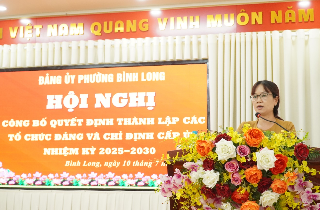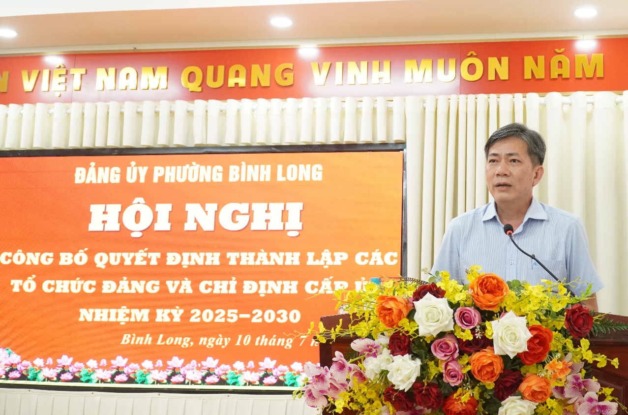 Sáng ngày 10-7, Đảng uỷ phường Bình Long, tỉnh Đồng Nai tổ chức hội nghị công bố quyết định thành lập các tổ chức đảng và chỉ định cấp uỷ nhiệm kỳ 2025-2030. Tỉnh ủy viên, Bí thư Đảng ủy phường Bùi Quốc Bảo chủ trì hội nghị.
